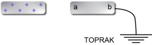 Bir ucu topraklanmış nötr bir cisme (+) yüklü bir cisim şekildeki gibi yaklaştırılıyor. Toprak bağlantısı kesildikten sonra (+) yüklü cisim uzaklaştırılıyor.