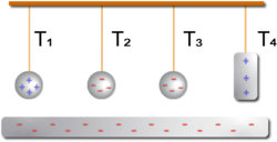 Birbirinden yeterince uzakta olan yükleri şekildeki gibi asılmıştır. Bu cisimlere alttan (-) yükle yüklenmiş olan bir çubuk yaklaştırılıyor.