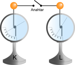 Yukarıda K ve L elektroskoplarının yük miktarlarının farklı olduğu ve K elektroskopunun pozitif L elektroskopunun negatif yüklü olduğu bilinmektedir.
