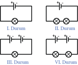 Özdeş pil ve ampullerin kullanıldığı yukarıdaki devrelerden hangisinde ampulün parlaklığı en azdır?