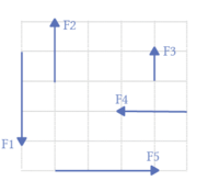 Kuvvet büyüklüklerini belirtmek için kullanılan kareli yüzeyde çizilen F1, F2, F3, F4, ve F5 aşağıdaki gibi gösterilmiştir.
